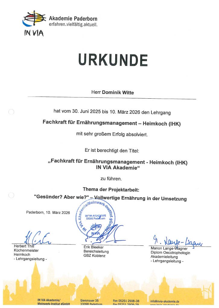 Besonders hervorzuheben ist auch sein persönliches Engagement im direkten Kontakt mit den Bewohnerinnen und Bewohnern: Durch gemeinsames Kochen schafft Herr Witte nicht nur gesunde Mahlzeiten, sondern auch wertvolle Momente der Gemeinschaft, Aktivierung und Freude. Er versteht es, Menschen einzubeziehen, Ressourcen zu stärken und Ernährung als positives Erlebnis zu gestalten.
